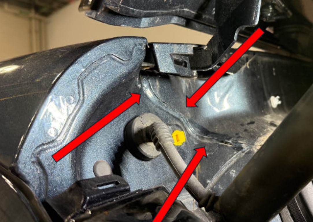 Costura de carrocería – Retire la moldura del canal izquierdo y derecho y revise las áreas de costura de la carrocería en busca de huecos en el sellador. (Fig. 13) Limpie y vuelva a sellar las costuras si encuentra huecos.