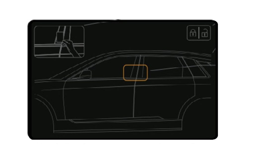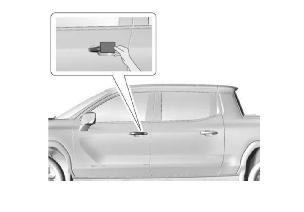 La tarjeta de llave utiliza la tecnología NFC (Near Field Communication), por lo que sólo hay que acercarla o mantenerla brevemente sobre el Módulo de respaldo NFC K300, o lector de tarjetas, en el exterior del vehículo para verificar que se presentó la llave correcta al vehículo. La ubicación para colocación de la tarjeta de llave se encuentra en la manija de la puerta del conductor en los modelos Acadia, Enclave, Silverado EV, Sierra EV, Tahoe, Suburban y Yukon. (Fig. 4)