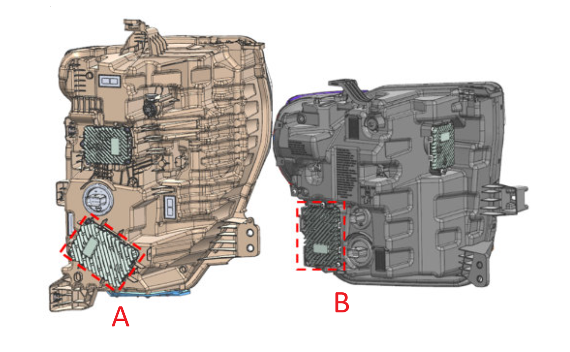 La operación intermitente de la iluminación delantera puede deberse a una falla interna del controlador LED multiuso (MLD), que controla las funciones de iluminación del ensamble de luces. (Fig. 2: A. MLD en el ensamble Chevrolet. B. MLD en el ensamble GMC). Si el MLD ha fallado, debe ser reemplazado.