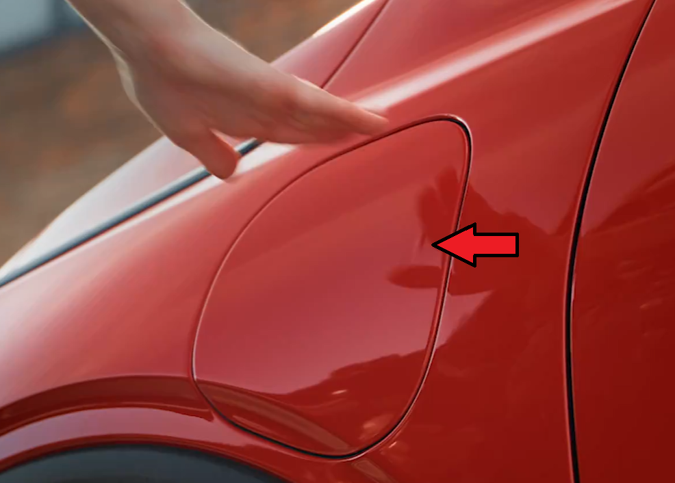El puerto de carga NACS tiene una puerta de carga con una pequeña protuberancia ovalada que indica dónde presionar para abrir o cerrar la puerta. (Fig. 3) Es posible que sea necesario aplicar cierta fuerza para garantizar que el émbolo y el seguro de la puerta de carga encajen completamente para abrir o cerrar la puerta.