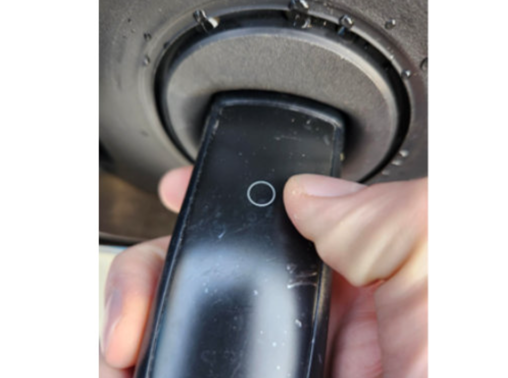 El juego de cables de carga estándar de doble nivel es similar al anterior juego de cables Ultium Nivel 2 utilizado con otros vehículos eléctricos de GM, excepto por el acoplador de carga NACS en lugar del acoplador CCS. Para desconectar el cable de carga de doble nivel de la toma de carga, presione el círculo pequeño (Fig. 4, como se muestra a continuación) en el acoplador NACS. Al presionarlo, se escuchará un leve sonido mecánico, lo que indica que se ha retirado el pasador de bloqueo de carga interno y que ahora se puede extraer el cable de carga del receptáculo.