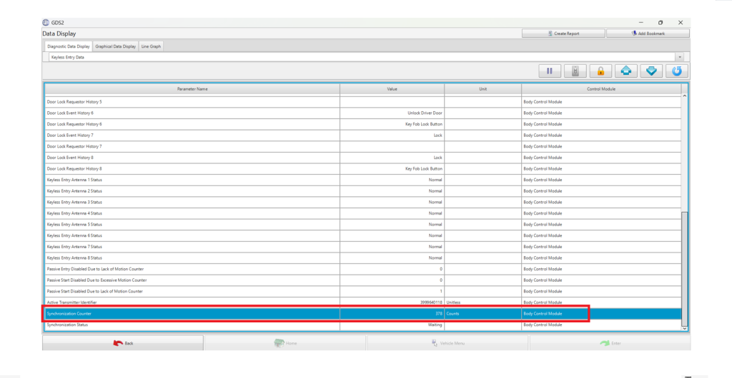 Si el parámetro Contador de sincronización aumenta pero el vehículo no responde al presiona ninguno de los botones del transmisor de llave, significa que el transmisor no está sincronizado con el Módulo de control de la carrocería (BCM).