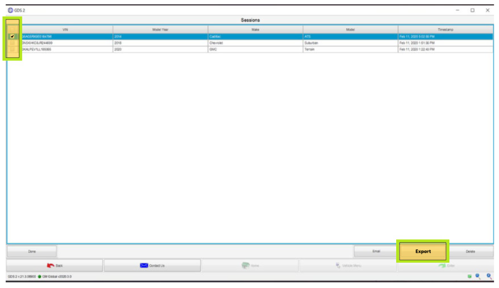 - Seleccione el número de identificación del vehículo (VIN) marcando la casilla junto al registro de sesión deseado y, a continuación, haga clic en el botón Exportar. (Fig. 16)
