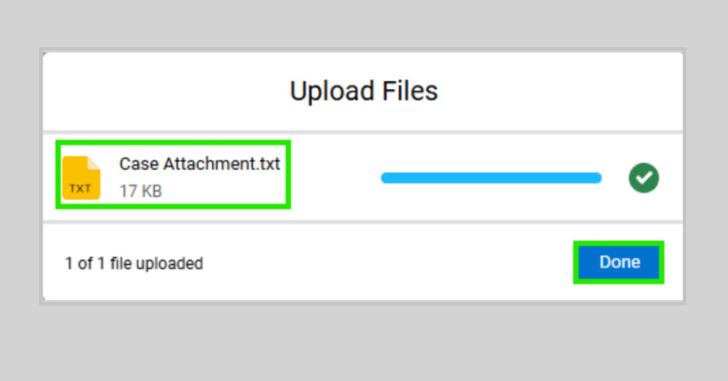 - Seleccione Cargar archivos, busque el archivo que guardó y, a continuación, haga clic en Abrir. Una vez que se cargue el archivo, aparecerá la pantalla de bienvenida Cargar archivos junto con el archivo adjunto. Haga clic en el botón Terminar para volver a la página del caso. (Fig. 19)
