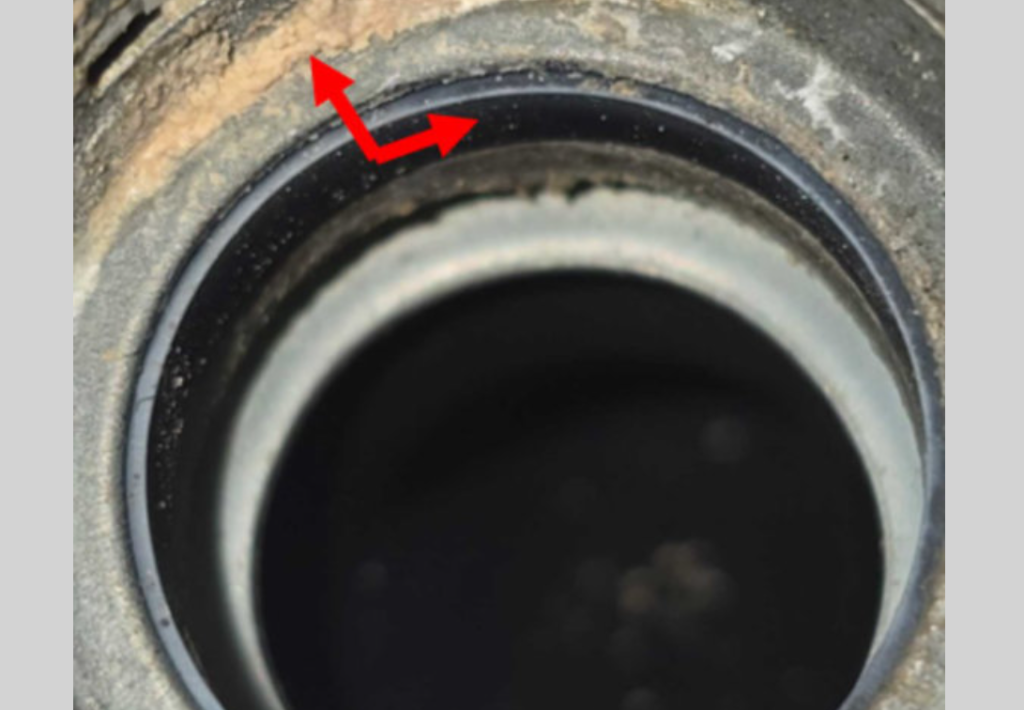 El desgaste del sello puede observarse con distintos grados de residuos o acumulación, dependiendo del uso del vehículo y del entorno de operación. Un sello de labio defectuoso, que suele presentar un aplanamiento del material y una acumulación de residuos alrededor de la conexión, indica un deterioro del sello en lugar de un defecto del radiador. (Fig. 13)
