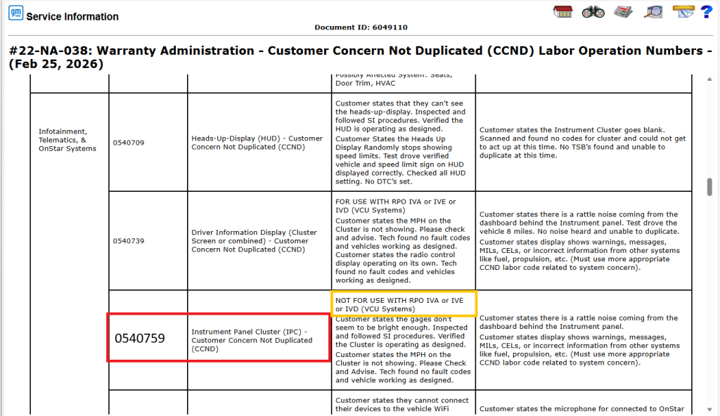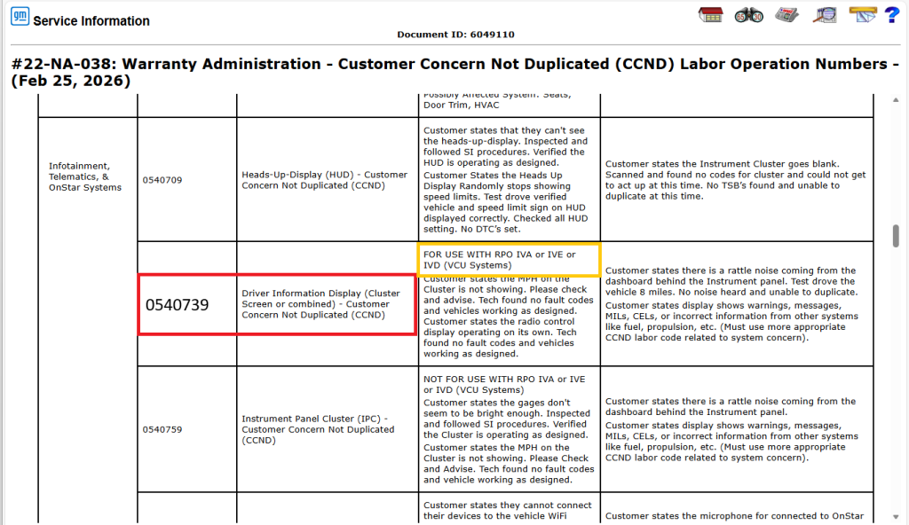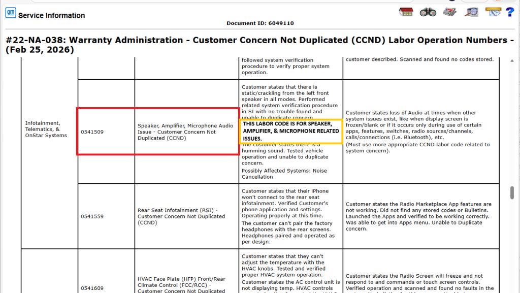Se publicó una actualización del Boletín #22-NA-038 que cubre los cambios en varias operaciones de mano de obra de Customer Concern Not Duplicated (Problema de cliente no duplicado, CCND) que atienden condiciones de la pantalla y problemas del sistema de audio en vehículos de pasajeros y camionetas GM 2022-2027 (excepto modelos Chevrolet LCF). El boletín actualizado ofrece una lista de operaciones de mano de obra, junto con descripciones y directrices para las condiciones de CCND relacionadas con diversos sistemas del vehículo.